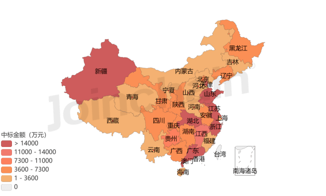 根据中标结果,2023年5月磁共振成像设备招标较活跃的地区主要在新疆维吾尔自治区,采购金额占比为12.49%,浙江省排在第二,金额占比为8.45%,山东省为第三位,金额占比为7.08%。