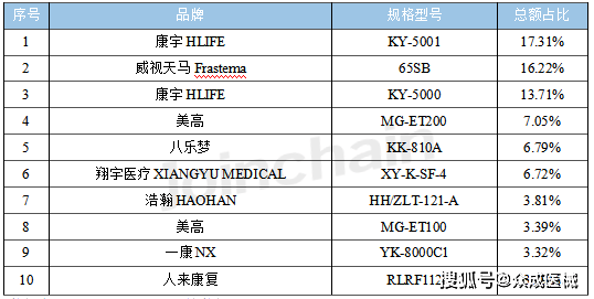 根据MDCLOUD(医械数据云)统计的已披露的品牌与金额数据结果,2023年5月中,康宇排名第一,金额占比为29.01%;威视天马排名第二,金额占比为15.17%;翔宇医疗排名第三,金额占比为12.47%。