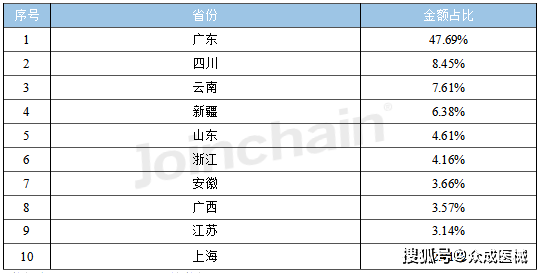 根据中标结果,2023年5月诊疗台招标较活跃的地区主要在广东省,采购金额占比为47.69%,四川省排在第二,金额占比为8.45%,云南省为第三位,金额占比为7.61%。