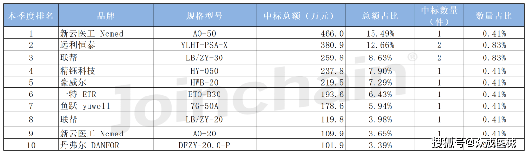 从型号上观察,2023年第一季度,新云医工型号为AO-50的医用制氧设备排在首位,其中标总额和数量分别为466.0万元和1件;排名第二的是远利恒泰的YLHT-PSA-X,中标金额为380.9万元,数量为2件;联帮排名第三,型号为LB/ZY-30,中标金额为259.8万元,数量为2件。