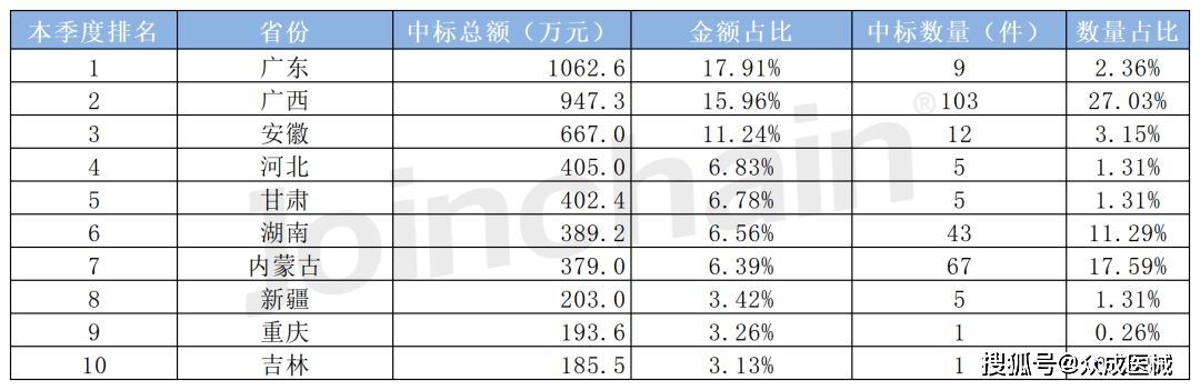 根据中标结果,2023年第一季度医用制氧设备招标较活跃的地区主要在广东省,采购金额约1062.6万元,占比17.91%;广西壮族自治区以采购金额947.3万元排在第二,占比15.96%;安徽省排在第三位,采购金额为667.0万元,占比11.24%。