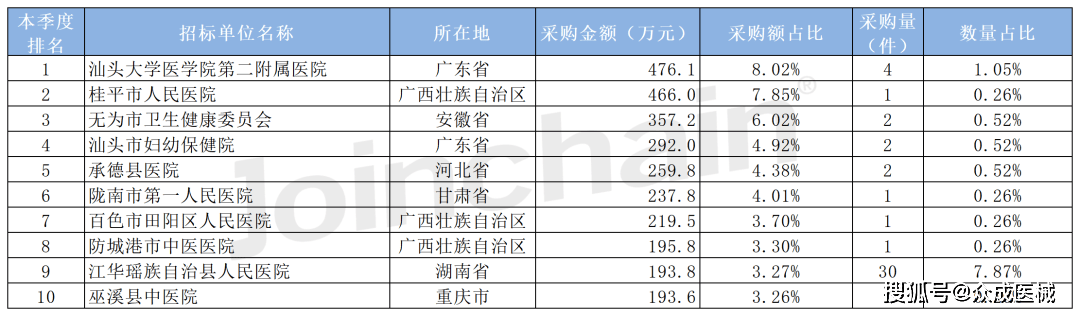 根据中标结果,2023年第一季度医用制氧设备采购金额最高的招标单位是汕头大学医学院第二附属医院,金额为476.1万元,数量为4件;桂平市人民医院以466.0万元采购额排名第二,数量为1件;无为市卫生健康委员会以357.2万元采购额排名第三,数量为2件。