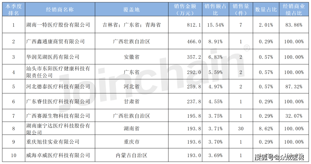 根据中标结果,2023年第一季度月总销售额最高的经销商是湖南一特医疗股份有限公司,销售额为812.1万元,销售数量为7件;广西鑫通康商贸有限公司排名第二,销售额和数量分别是466.0万元和1件;排名第三的是华润芜湖医药有限公司,销售额和数量分别是357.2万元和2件。