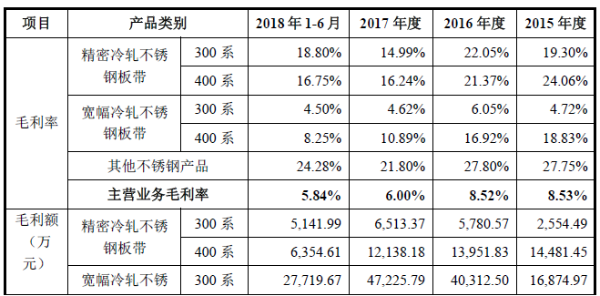 其中300 系宽幅冷轧不锈钢板带在2017年的收入占比达到86.20%,毛利额为47,225.79 万元,毛利贡献率达到66.42%。而300 系宽幅冷轧不锈钢板带2018年1-6月毛利率不足5,直接拉低公司主营业务毛利率。据披露,公司主要产品平均售价和平均营业成本变动情况如下表所示: