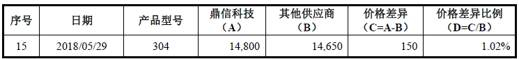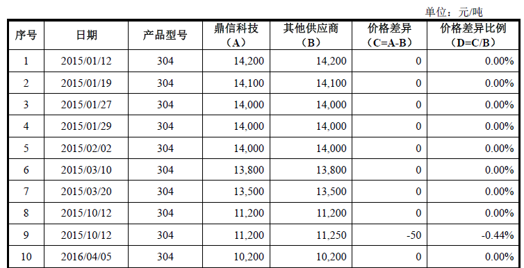 由上表对比分析可知,江苏甬金向鼎信科技和其他非关联供应商的采购价格持平或存在较小的差异。鉴于不同供应商交货方式和运输距离不同、当日市场供需情况及订单先后、合作紧密度等因素,整体来说,价格差异在合理范围内,符合行业特征。