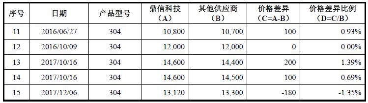 同时,在上游热轧厂商产量稳定的情况下,同一天热轧原材料价格也可能会受当天市场需求的变化而发生变动。因此,保荐机构、会计师向鼎信科技获取了报告期内与其他客户签订的部分销售合同,根据鼎信科技提供的符合条件的合同样本,保荐机构、会计师将鼎信科技对同一天销售给江苏甬金和福建甬金以及销售给其他客户的300 系同一钢种热轧原材料价格进行对比分析。