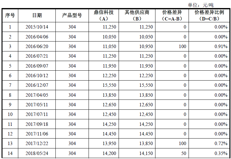保荐机构、会计师核查了报告期内江苏甬金300 系热轧原材料的采购台账和交易合同,随机选取了江苏甬金同一天向鼎信科技与其他非关联供应商采购300系同一钢种热轧原材料的价格数据(含税)进行对比分析,如下表所示: