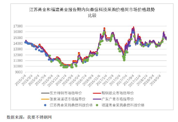 上图显示,报告期内,江苏甬金和福建甬金与鼎信科技的采购价格数据与选取的四家不锈钢厂商在无锡市场的市场指导价格整体走势相吻合。