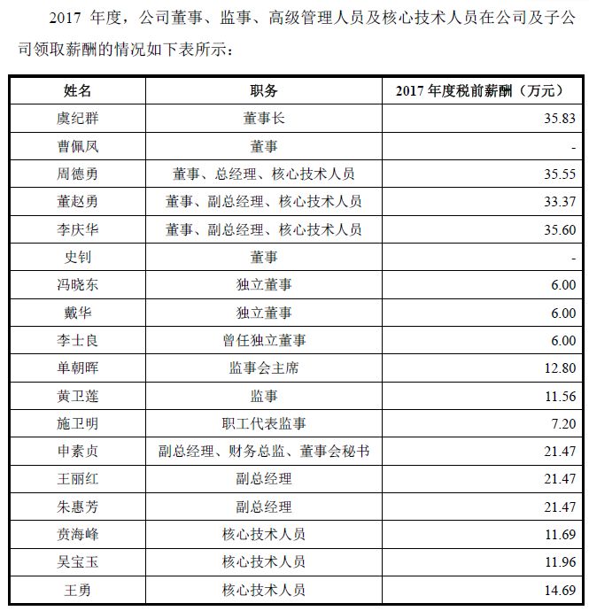 值得注意的是,截至2018年6月30日,公司受教育程度硕士及以上学历的仅有3人,占比为0.24%。与硕士及以上占比低相对应的还有,公司核心技术人员薪资也不高。据披露,公司董事长、总经理等薪资约36万,不担任管理职位的核心技术人员薪资不足12万。