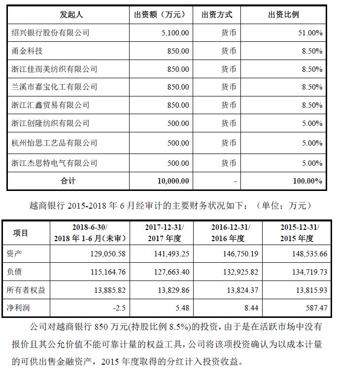 公司的可供出售金融资产系甬金科技2010 年对越商银行进行股权投资,并持有其8.5%的股权。