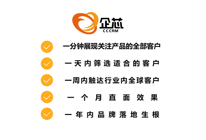 在企芯的帮助下,外贸企业的订单周期平均可减少50%,业务总效率平均可提升60%,营销效率平均可提升80%,撞单概率降低55%,挖掘潜力客户提升60%,平均收入增长85%。未来,企芯将继续完善系统,为客户提供海量数据资源,帮助客户增加获客几率、降低合作风险。欢迎大家试用企芯CRM系统,企芯CRM,永久免费,一个可以给您带来订单的CRM系统~免费试用热线:。