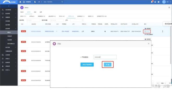 投标截止时间后,有足够的数量的供应商投标,状态置为“待开标”,开标员点击开标按钮后,若无未启用开标密码和评标环节则开标完成,若启用密码开标,必须填写正确的开标密码。