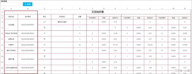 开标后,系统可按照报价单明细项维度,对成本因素进行横向分析。采购方能够清晰、明了地比对各家供应商填报的明细项金额,包括含税价、税金、总金额等信息。同时,系统支持供应商通过导入明细清单的方式进行填报,从而减少填报时间,规避填报差错。