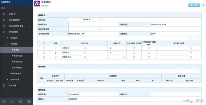 系统设置评标专家库,可根据专家的特长进行标签化设置,系统自动随机抽取专家进行评标,抽取后,通过短信平台等进行评标任务通知及确认。