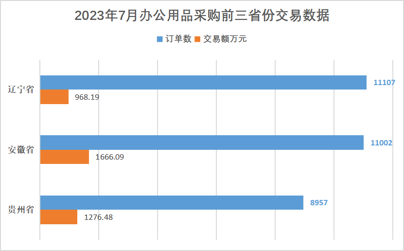 《报告》显示,7月有15个省份的21个网上商城中有办公用品采购的交易数据,其中订单数最多的是辽宁省,有11107单,占总订单数的24.05%;其次安徽省,有11002单米乐m6官方网站,占总订单数的23.82%;第三是贵州省,有8957单,占总订单数的19.39%。交易额最多的是广东省,交易额为2120.05万元,占总交易额的22.98%;其次是安徽省,交易额为1666.09万元,占交易额的18.06%;第三是贵州省,交易额为1276.48万元,占总交易额的13.84%。
