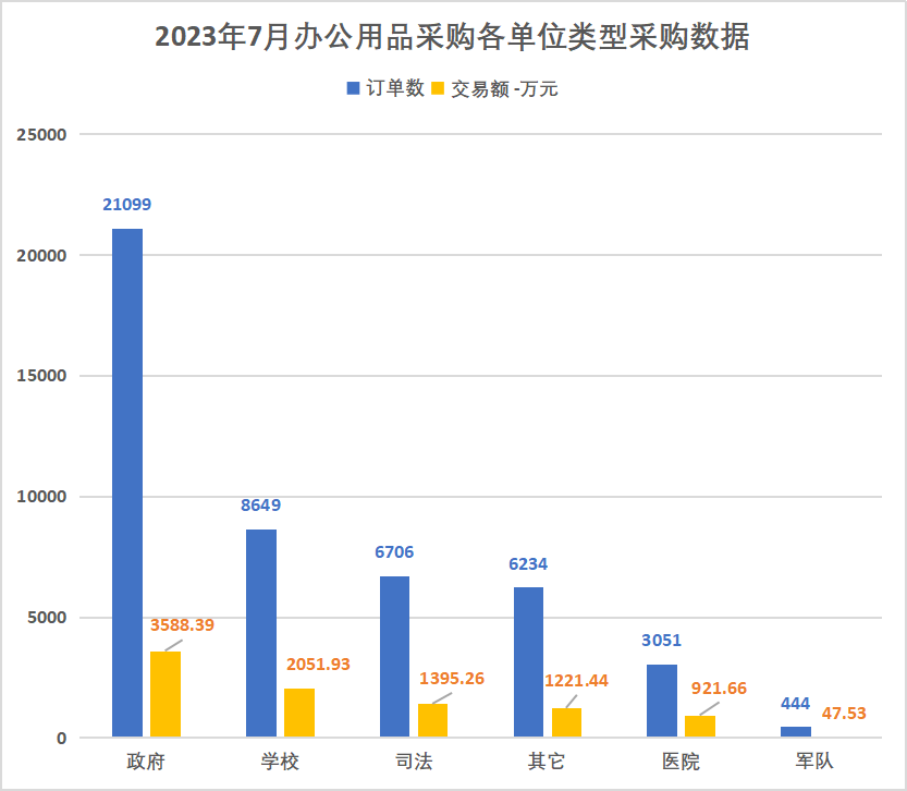 mile米乐m6日前,国家统计局公布的国民经济运行数据显示,7月国民经济持续恢复,总体延续向好态势,虽然部分主要指标增速有所放缓,但属于月度之间的正常波动。云采数坊《全国政府网上商城2023年7月办公用品采购数据报告》(以下简称《报告》)显示:相较于6月份,7月政府网上商城办公用品采购数据略有下降。7月共有9904家采购单位和6329家供应商利用政府网上商城参与交易,交易总订单量为46183单,总交易额为9226.23万元。
