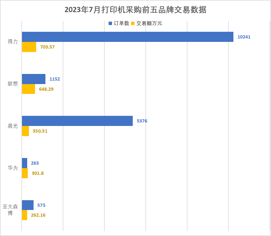 快速、高效、透明,是网上商城带给用户最深刻的感受。目前,大到电脑,小到A4纸,几乎所有办公用品甚至防疫物资都通过网上商城进行采购,并且可选品牌众多,采购人还可根据价格、克重、颜色、包装、单包数量等缩小选择范围。《报告》显示,7月办公用品采购中,采购人偏重于采购得力、联想、晨光、华为、亚太森博等5个知名度较高的品牌。5个品牌商品总订单量为17607笔,占订单量的38.12%;交易额为2266.13万元,占总交易额的24.56%。