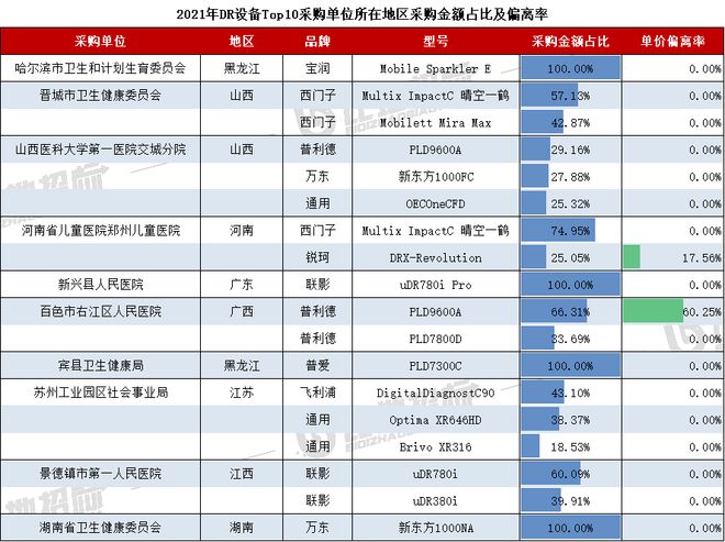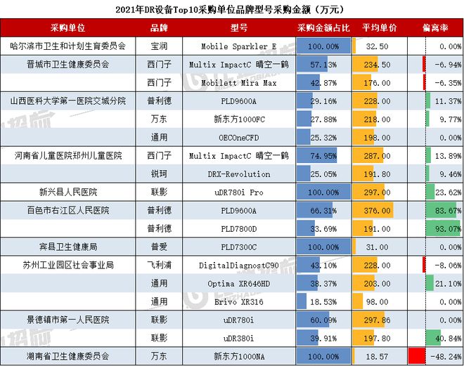 在2021年DR设备采购金额Top10采购单位的所在地区采购金额表中可以看到,除了百色市右江区在广西地区采购的普利德PLD9600A存在价格偏高的情况外,大部分采购单位所采购的DR设备在所在地区中采购单价偏离率均在合理波动内,符合所在地区供需关系米乐M6官方入口,详见下表。