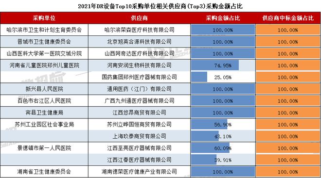 在2021年DR设备采购金额Top10采购单位的相关供应商采购金额表中可以看到,采购单位与供应商在此产品上互相依存程度较高,详见下表。