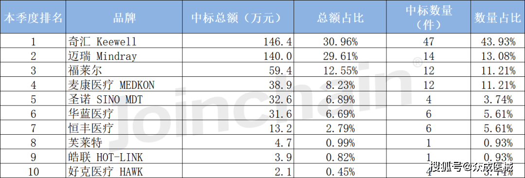 根据MDCLOUD(医械数据云)统计的已披露的品牌与金额数据结果,2023年第一季度中,奇汇排名第一,中标总额为146.4万元,中标数量为47件。迈瑞排名第二,中标总额和中标数量分别为140.0万元和14件。福莱尔排名第三,中标总额和中标数量分别为59.4万元和12件。