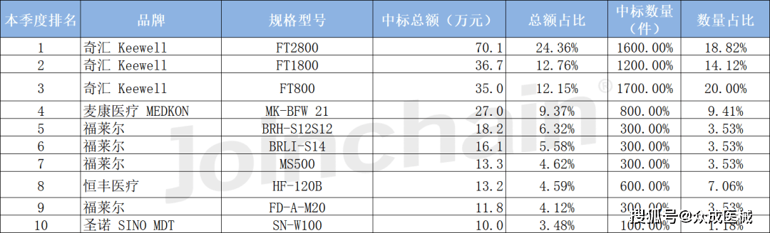 从型号上观察,2023年第一季度,奇汇的相关型号在输液辅助电子设备占据了相当大的市场,奇汇的型号为FT2800、FT1800和FT800的产品包揽前三,中标总额分别为70.1万元、36.7万元和35.0万元,数量分别为16件、12件和17件。