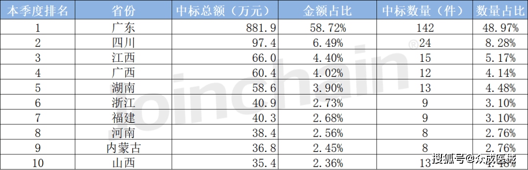 根据中标结果,2023年第一季度输液辅助电子设备招标较活跃的地区主要在广东省,采购金额约881.9万元,占比58.72%;四川省以采购金额97.4万元排在第二,占比6.49%;江西省排在第三位,采购金额为66.0万元,占比4.40%。