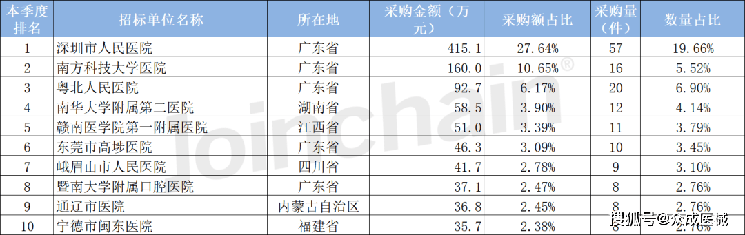 根据中标结果,2023年第一季度输液辅助电子设备采购金额最高的招标单位是深圳市人民医院,金额为415.1万元,数量为57件;南方科技大学医院以160.0万元采购额排名第二,数量为16件;粤北人民医院以92.7万元采购额排名第三,数量为20件。
