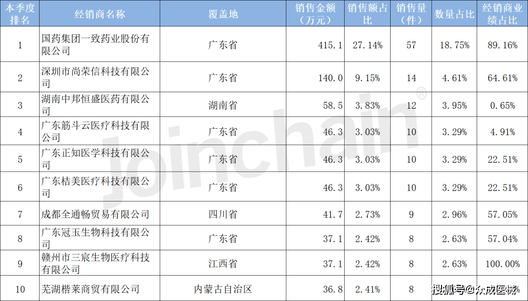 根据中标结果,2023年第一季度月总销售额最高的经销商是国药集团一致药业股份有限公司,销售额为415.1万元,销售数量为57件;深圳市尚荣信科技有限公司排名第二,销售额和数量分别是140.0万元和14件;排名第三的是湖南中邦恒盛医药有限公司,销售额和数量分别是58.5万元和12件。