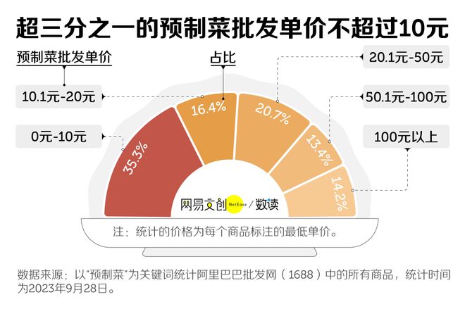 我们统计了 1688 批发采购网上的预制菜价格,超三分之一的预制菜批发单价不超过 10 元,约一半的料理包单价都在 20 元以内。