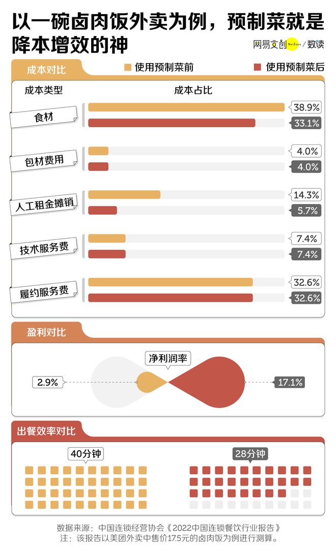 据中国连锁经营协会的估算,一份售价 17.5 元的卤肉饭外卖,如果厨师现场制作,m6米乐官网app登录净利润只有五毛钱,而使用料理包,m6米乐官网app登录能达到三元,足足涨了五倍 [5]。
